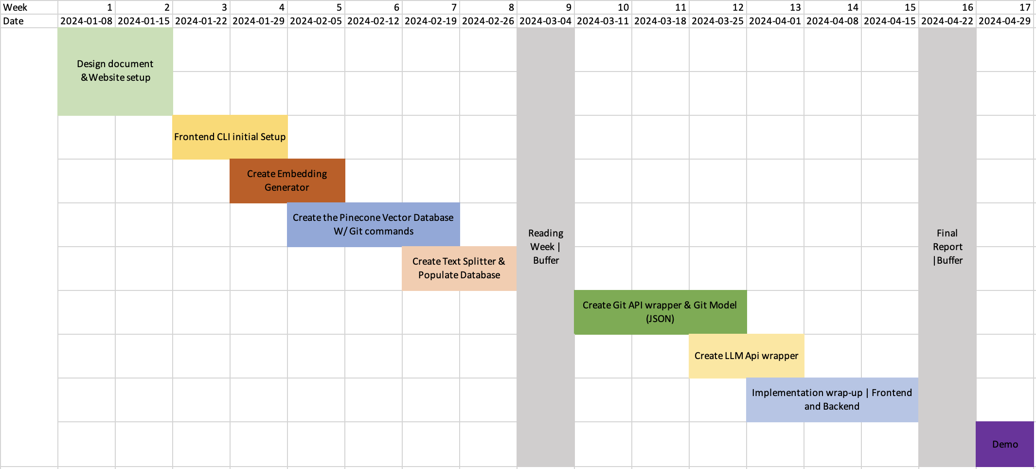 These weeks have been more busy than I expected due to the workload from my four other classes. With that being said, I was able to stay on track with my schedule and create the vector database and populate it with git commands comming from the following book that I found online : https://goalkicker.com/GitBook/GitNotesForProfessionals.pdf